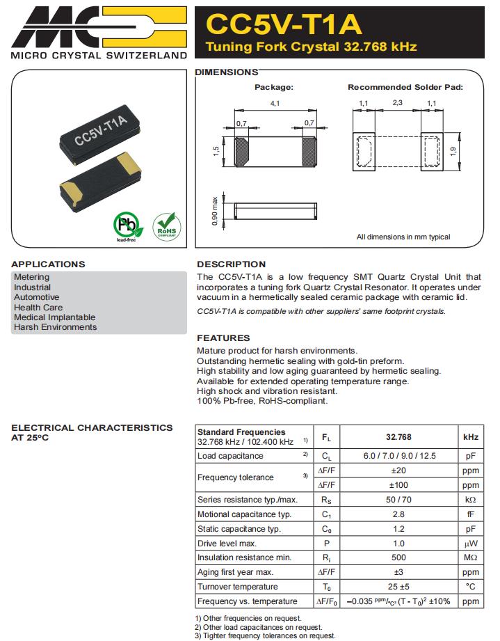 更多>>微晶發布新興的輕薄型32.768K音叉晶體CC5V-T1A-32.768kHz-6pF-20PPM-TA-QC