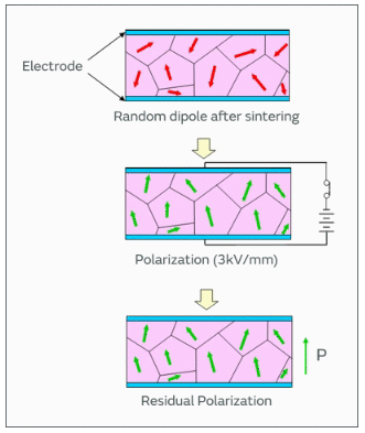 在經(jīng)受燒制之后,鐵電陶瓷將立即產(chǎn)生具有隨機(jī)極軸的自發(fā)極化.總的來(lái)說(shuō),陶瓷似乎具有良好平衡的正負(fù)電荷.然而,通過施加高DC電壓,由自發(fā)極化產(chǎn)生的極軸在均勻方向上對(duì)準(zhǔn),即使去除電壓也不能取消.對(duì)準(zhǔn)自發(fā)極化的極軸的過程稱為極化過程.