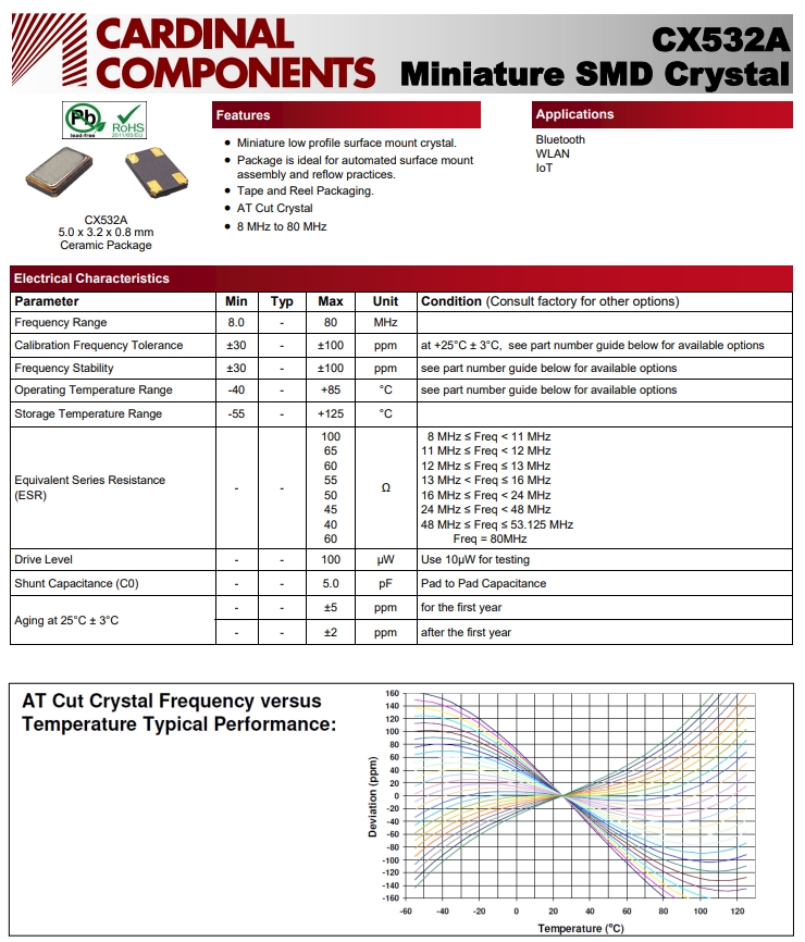 CX532Z-A2B3C5-70-8.0D18 | Cardinal晶振 | CRYSTAL 8.0000MHZ 18PF SMD | CX532 | 8MHz | ±30ppm | -40°C ~ 85°C |
