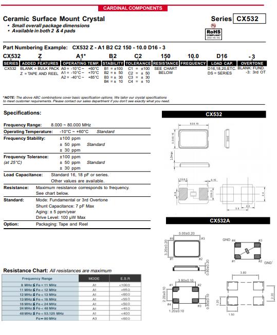 CX532Z-A2B3C5-70-16.0D18 | Cardinal晶振 | CRYSTAL 16.0000MHZ 18PF SMD | CX532 | MHz Crystal | 16MHz | ±30ppm | 70 Ohm | -40°C ~ 85°C |