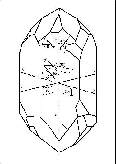 晶片的切割可分為AT-CUT, BT-CUT, CT-CUT, DT-CUT, FT-CUT, XT-CUT, YT-CUT,如圖所示.它是以光軸(Z軸)為參考而命名,每種切法對應一個角度.采用何種切法應根據實際情況而定,如對溫度特性要求較好則應采用AT-CUT,如果對晶振要求的頻率較高時則采用BT-CUT.晶片的切割方式、幾何形狀、尺寸等決定了晶振的頻率.
