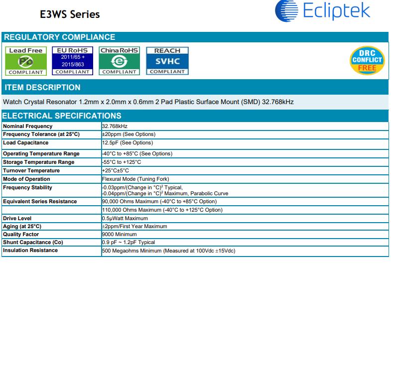 E3WSDC12-32.768K TR | Ecliptek晶振 | CRYSTAL 32.7680KHZ 12PF SMD | -40°C ~ 85°C |