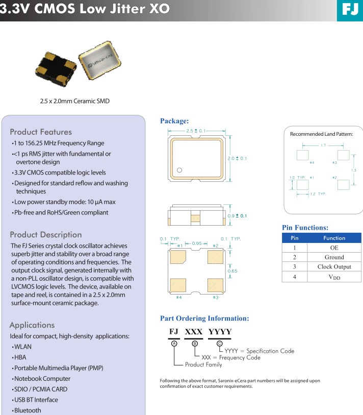 更多>>亞陶diodes晶振ECERA品牌編碼FJ2400011是一款高密度的時鐘振蕩器,廣泛用于便攜式多媒體播放器