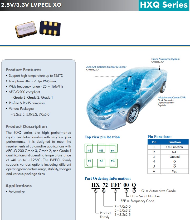 HXQ系列是具有極低抖動的高性能晶體振蕩器系列表現。HXQ-LVPECL系列2.5V/3.3V、小體積尺寸3.2x2.5mm、汽車級、高溫LVPECL晶體振蕩器,它旨在滿足汽車應用的要求AEC-Q 200 3級、2級和1級認證和工作溫度范圍-40°C 至 +125°C。LVPECL系列支持各種選項,包括不同的工作溫度范圍、穩定性、電壓和各種封裝尺寸。