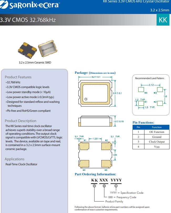 編碼KK3270049是一款超小型低損耗的有源晶振,石英晶體振蕩器,特性:32.768千赫,3.3V CMOS兼容邏輯電平,低功耗待機模式(< 10μA),低功率有功模式(<0.3mA典型),設計為標準回流和清洗技術,無鉛,符合RoHS/綠色標準