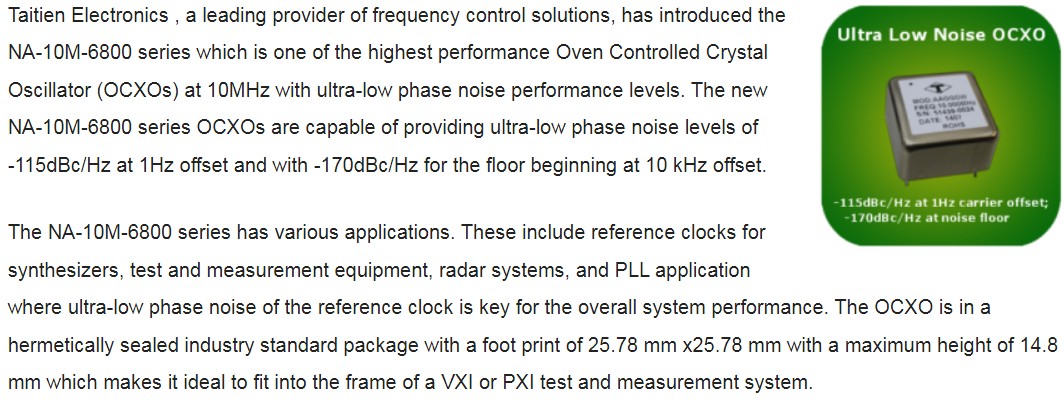 頻率控制解決方案的領(lǐng)先供應(yīng)商泰藝晶振推出了NA-10M-6800系列,它是性能最高的10MHz恒溫晶體振蕩器 (OCXO) 之一,具有超低相位噪聲性能水平。新的NA-10M-6800系列OCXO能夠在1Hz偏移處提供 -115dBc/Hz的超低相位噪聲水平,在 10kHz 偏移處開始提供 -170dBc/Hz 的本底噪聲水平。
