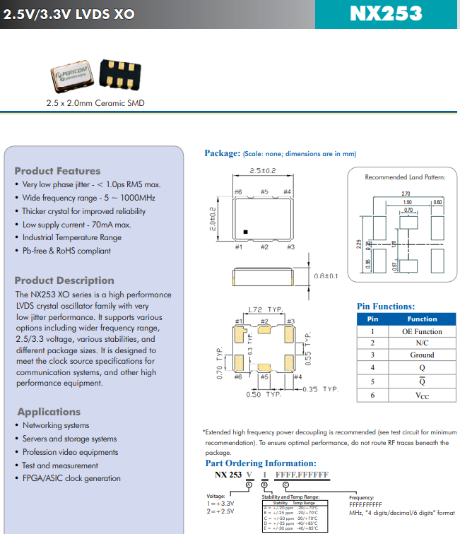 NX253 | LVDS | 3.32.5 | 5 到 1000 | <1 | 2.5x2.0x0.9 | 6 | 2.5mmx2.0mm LVDS 可編程 XO | |