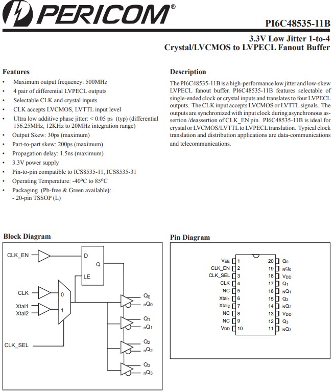 更多>>PI6C48535-11B是晶體或LVCMOS/LVTTL到LVPECL轉換的理想選擇