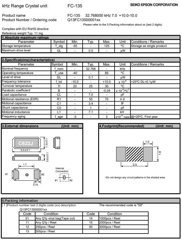 Q13FC1350006100 | 3.2 x 1.5 x 0.9 mm | FC-135 | 32.768kHz | 6.5 pF | +/-20.0 ppm | -40 to +85 °C |