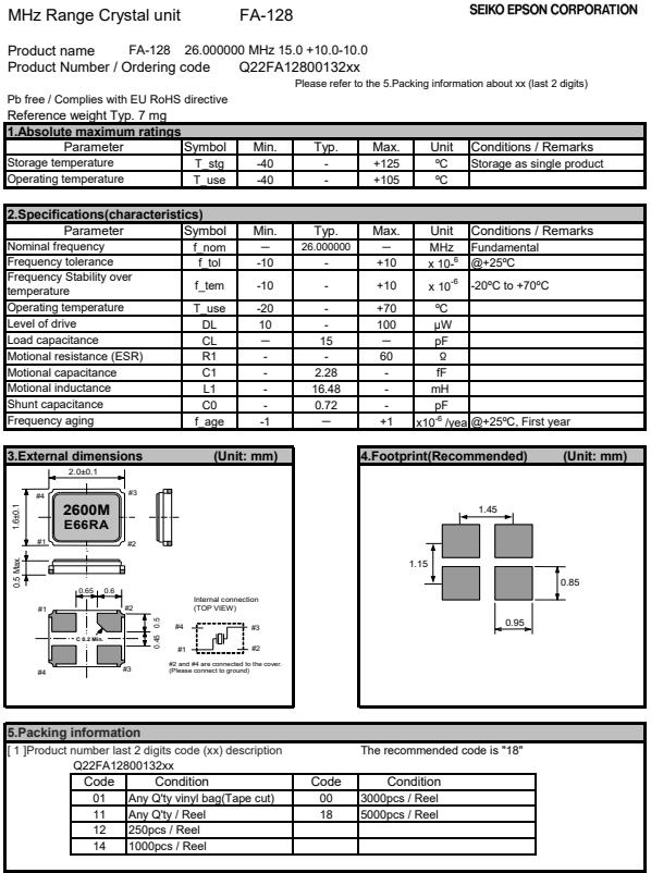 Q22FA1280014000 | 2 x 1.6 x 0.5mm | FA-128 | 26.000000 MHz | 9 pF | +/-10 ppm |