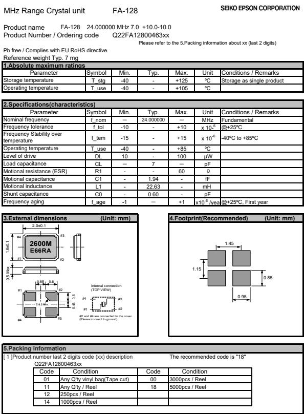 Q22FA1280046300 | 2 x 1.6 x 0.5mm | FA-128 | 24.000000 MHz | 7 pF | +/-10 ppm |