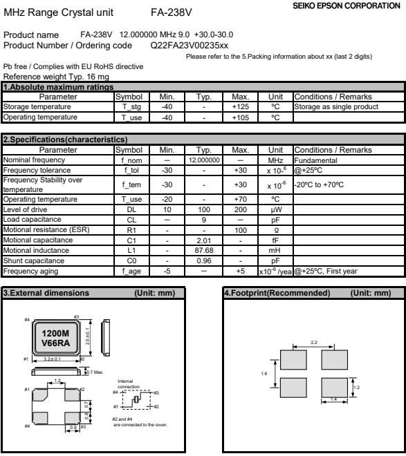 Q22FA23V0017000 | 3.2 x 2.5 x 0.7mm | FA-238V | 12.000000 MHz | 12 pF | +/-30 ppm | +/-30 ppm | -20 to +70 °C |