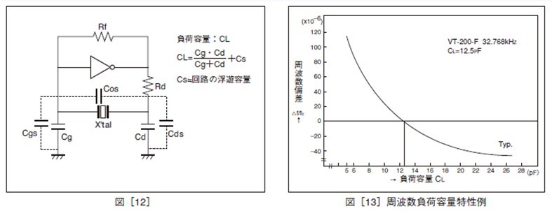負荷容量(CL)は、振動子を発振回路で使う條件として決めるためのもので、発振回路において振動子の両端子から 発振回路側を見た実効的な直列等価靜電容量で表されます(図[12]參照)。