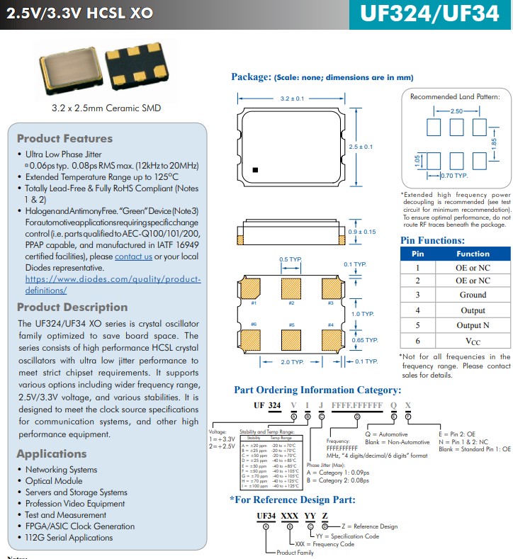 UF324/UF34 XO系列是經(jīng)過優(yōu)化的晶體振蕩器系列,可節(jié)省電路板空間。UF324/34系列,小體積尺寸3.2x2.5mm、超低抖動(dòng)HCLS晶體振蕩器,該系列由具有超低抖動(dòng)性能的高性能HCSL晶體振蕩器組成,可滿足嚴(yán)格的芯片組要求。它支持多種選擇,包括更寬的頻率范圍、2.5V/3.3V電壓和各種穩(wěn)定性。它旨在滿足通信系統(tǒng)和其他高性能設(shè)備的時(shí)鐘源規(guī)范。