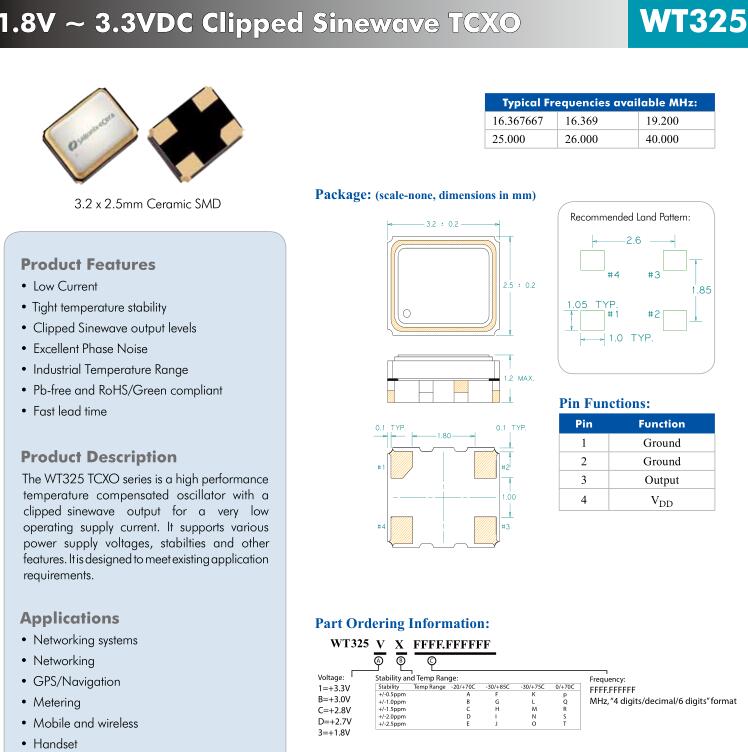 更多>>diodes晶振的WT325CF0026.000000是一款微型,環保TCXO振蕩器,廣泛應用于GPS導航