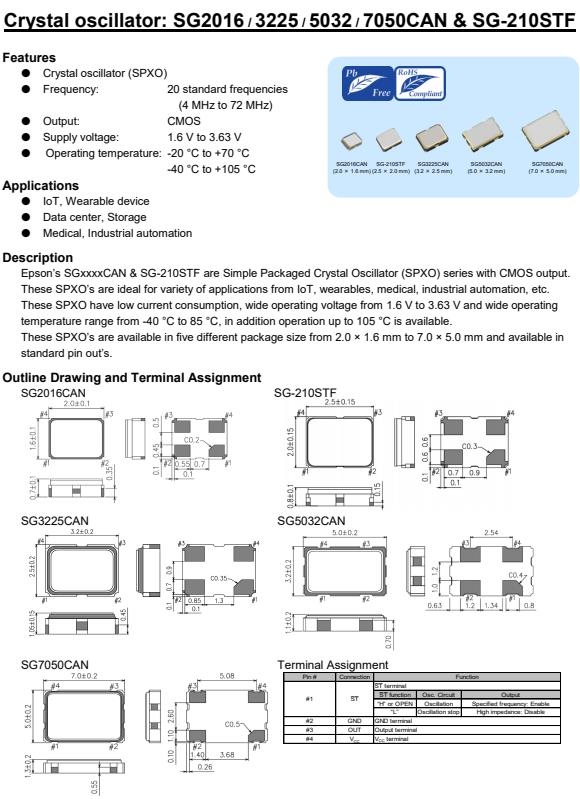 愛普生晶振的SGxxxxCAN和SG-210STF是具有CMOS輸出的簡單封裝晶體振蕩器(SPXO)系列。頻率20.000000兆赫,輸出WaveCMOS,供電電壓1.60至3.63 V,尺寸(長×寬×高)2.00 × 1.60 × 0.70毫米,工作溫度-40到+105°C,頻率公差±50ppm,額外的OptionsN /這些SPXO是物聯網、可穿戴設備、醫療、工業自動化等各種應用的理想選擇。這些SPXO具有低電流消耗,寬工作電壓從1.6 V到3.63 V,寬工作溫度范圍從-40°C到85°C,另外可操作到105°C。