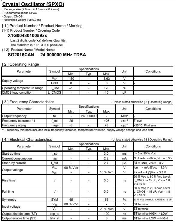 X1G004801005900 | SG2016CAN | 24.000000 MHz | 2.00 x 1.60 x 0.70 mm | CMOS | 1.600 to 3.630 V | -20 to 70 °C | +/-25 ppm |