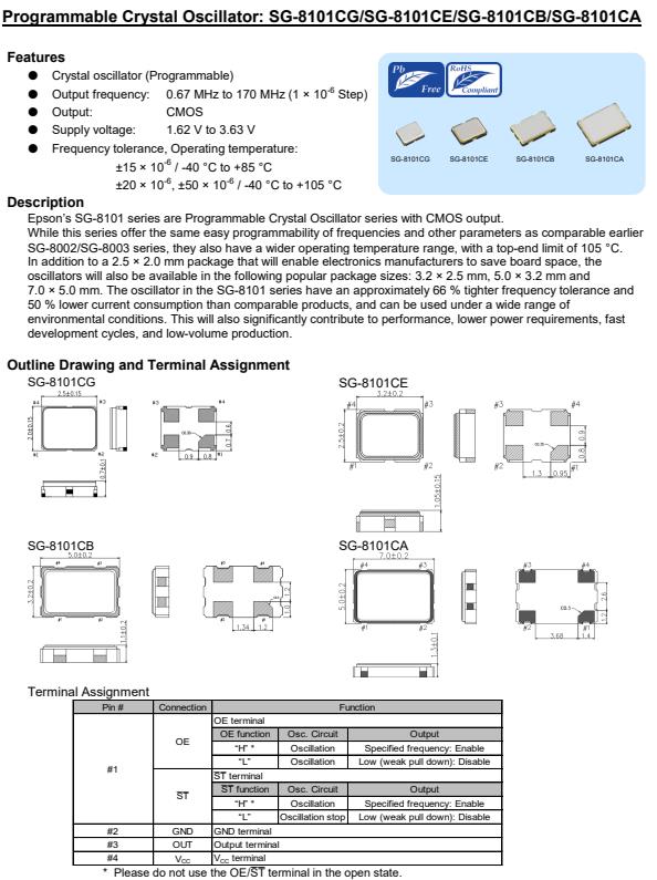 X1G005191003100 | SG-8101CA | 10.000000 MHz | 7.00 x 5.00 x 1.40 mm | CMOS | 1.620 to 3.630 V | -40 to 105 °C |