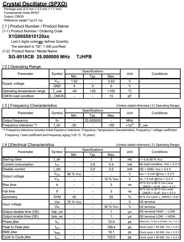 X1G005581012000 | SG-8018CB | 25.000000 MHz | 5.00 x 3.20 x 1.30 mm | CMOS | 1.620 to 3.630 V | -40 to 105 °C | +/-50 ppm |