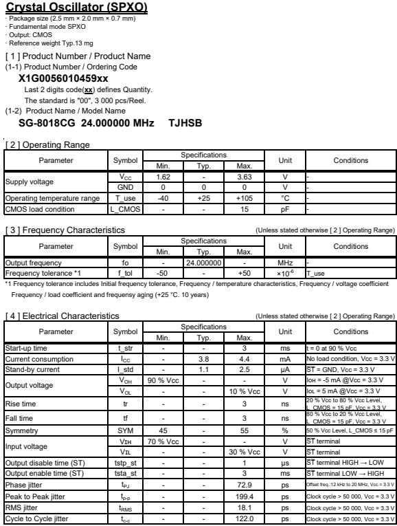 X1G005601045900 | SG-8018CG | 24.000000 MHz | 2.50 x 2.00 x 0.80 mm | CMOS | 1.620 to 3.630 V | -40 to 105 °C | +/-50 ppm | ≤ 4.4 mA |