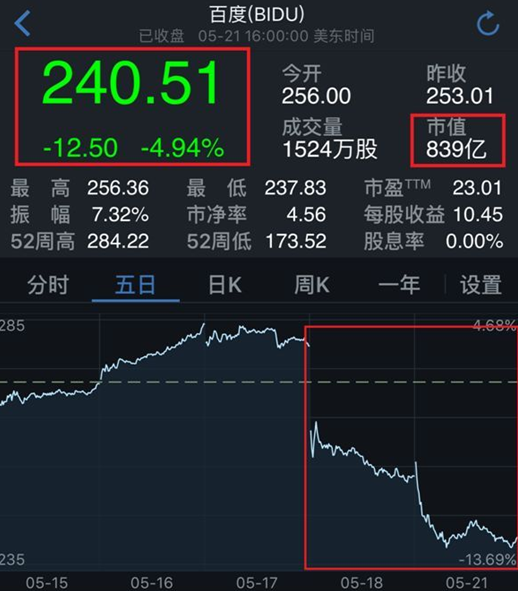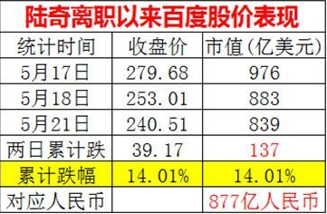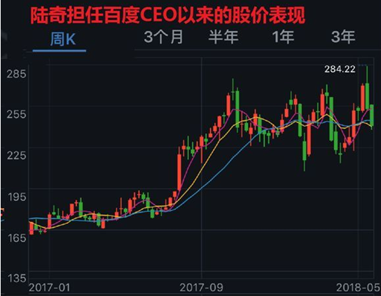 陸奇,百度集團(tuán)總裁兼首席運(yùn)營官,畢業(yè)于復(fù)旦大學(xué),獲計算機(jī)科學(xué)學(xué)士、碩士學(xué)位。曾就讀于卡耐基梅隆大學(xué),獲計算機(jī)科學(xué)博士學(xué)位。他除了在學(xué)術(shù)界發(fā)表過一系列高質(zhì)量的研究論文,還持有40多項美國專利。 短短兩個交易日,百度的股價從279.68元,下跌到了240.51元,跌幅超過了14%。