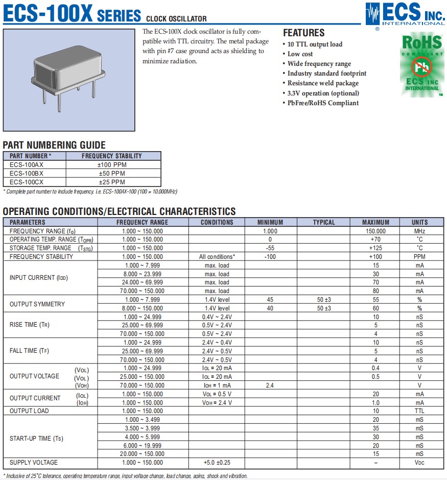 ECS-100AX-010 | ECS晶振 | ECS-100X | 1MHz | 0°C ~ 70°C | 0.821" L x 0.520" W (20.86mm x 13.20mm) |