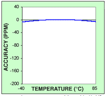 理想的精確計時裝置是將RTC,TCXO和石英晶體集成到一個封裝中的裝置.DS3231S就是這樣一種設備.它在0°C至+40°C范圍內提供±2.0ppm的無與倫比的精度,相當于每年超過±1.0分鐘.-40°C至0°C和+40°C至+85°C的精度為±3.5ppm,相當于每年±1.8分鐘.圖4顯示了該器件的最壞情況精度.如前一節所述,集成的TCXO使晶體曲線的拋物線特性在溫度范圍內變平.