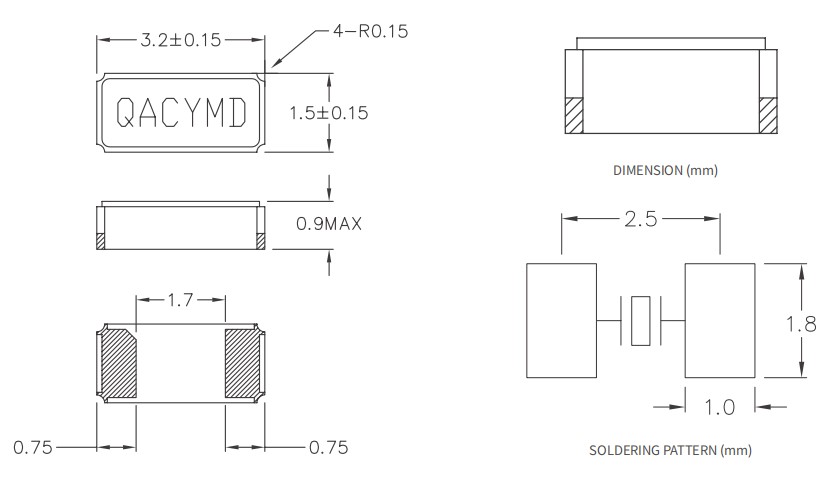 Interquip計(jì)時(shí)產(chǎn)品,SMLF-3215,3215mm晶振,6G顯示器晶振,智能手機(jī)晶振,石英貼片晶振,尺寸圖