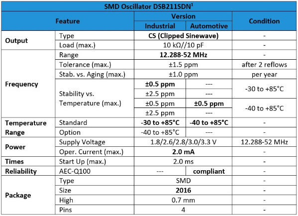 1所選參數(shù),具有所有特性的完整表及其有效性的相應(yīng)條件可在石英晶體振蕩器DSB211SDN的數(shù)據(jù)表中找到.表中給出的規(guī)格適用于標(biāo)準(zhǔn)"工業(yè)"或"汽車"振蕩器.
