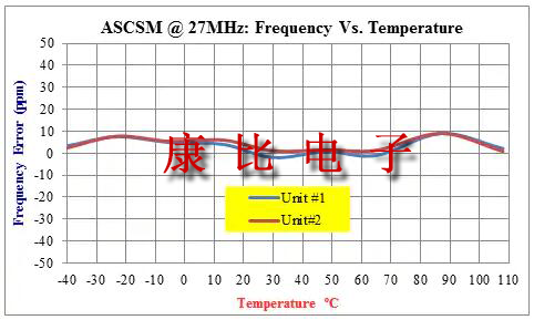 這一先進的MEMS振蕩器系列采用傳統的分數合成方法,并配有溫度校正電路.該技術可在-40ºC至+105ºC的耐高溫晶振寬工作溫度范圍內實現±10ppm的溫度穩定性.圖(4)描述了Abracon的ASCSM系列MEMS振蕩器的典型溫度誤差.