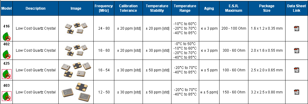 頻率公差@ 25°C | ±10ppm, ±15ppm, ±20 ppm, ±30 ppm, ±50 ppm | ||||