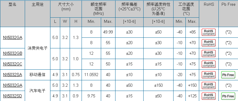 頻率公差 | Max. ±25 ×10-6 | Max. ±50 ×10-6 | Max. ±100 ×10-6 | |