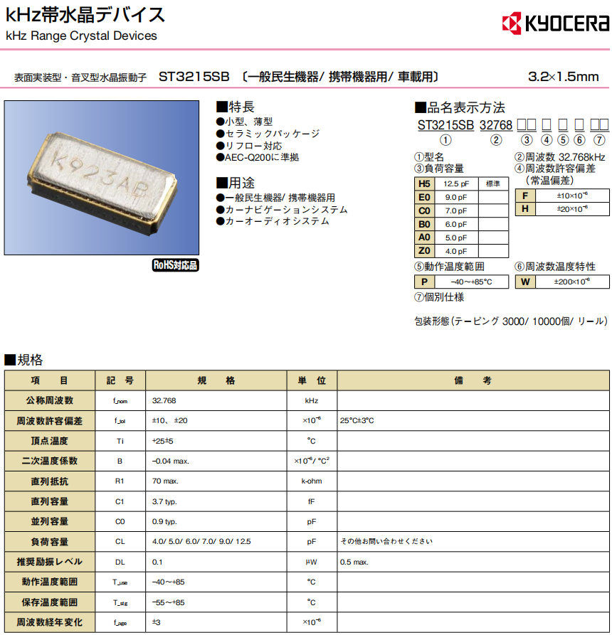 ST3215SB32768H5HPWZZ | Kyocera晶振 | ST3215SB | 32.768kHz | -40°C ~ 85°C | 2-SMD, No Lead |
