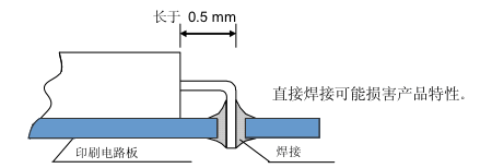 產品的玻璃部分直接彎曲引腳或用力拉伸引腳會導致在引腳根部發生密封玻璃分裂(開裂),也可能導致氣密性和產品特性受到破壞.當晶體產品的引腳需彎曲成下圖所示形狀時,應在這種場景下留出0.5mm的引腳并將其托住,以免發生分裂.當該引腳需修復時,請勿拉伸,托住彎曲部分進行修正.在該密封部分上施加一定壓力,會導致氣密性受到損壞.所以在此處請不要施加壓力.另外,為避負機器共振造成引腳疲勞切斷,建議用粘著劑將產品固在定電路板上.