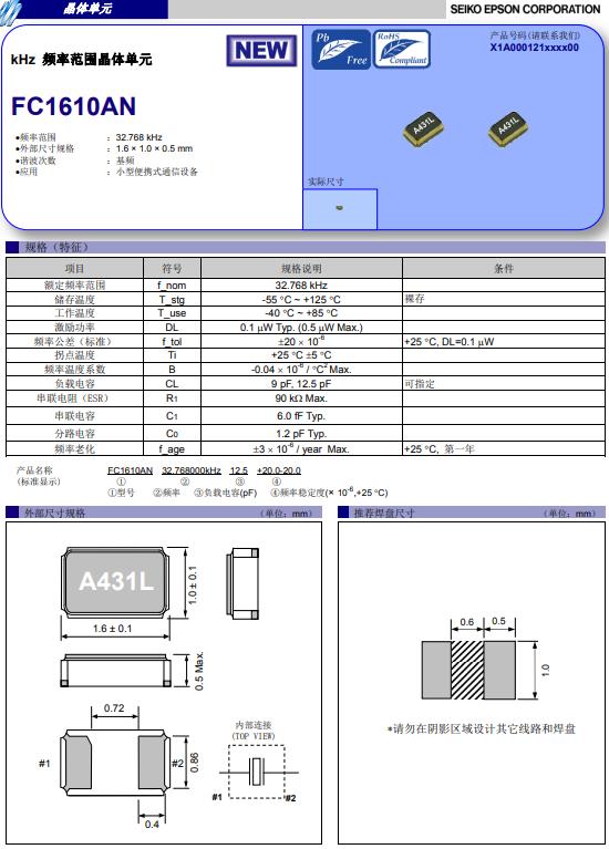 EPSON晶振,小體積晶振,FC-1610AN晶振,小體積SMD時(shí)鐘晶體諧振器,是貼片音叉晶體,千赫頻率元件,應(yīng)用于時(shí)鐘模塊,智能手機(jī),全球定位系統(tǒng),因產(chǎn)品本身體積小,SMD編帶型,可應(yīng)用于高性能自動(dòng)貼片焊接,被廣泛應(yīng)用到各種小巧的便攜式消費(fèi)電子數(shù)碼時(shí)間產(chǎn)品,環(huán)保性能符合ROHS/無(wú)鉛標(biāo)準(zhǔn)