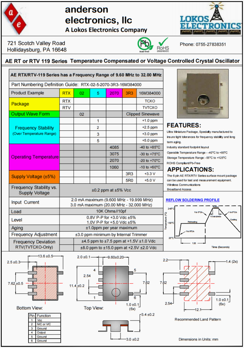 AE RT或RTV 119系列溫度補償振蕩器或壓控振蕩器。AE RTX/RTV-119系列的頻率范圍為9.60 MHz至32.00 MHz