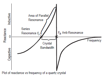 在電學上,石英晶體可以由圖1的等效電路表示,其中串聯組合R1,L1和C1表示壓電效應對阻抗的貢獻,C0表示電極之間的分流電容以及任何雜散電容.電感L1是石英質量的函數,而電容C1與其硬度相關聯.電阻R1由石英和安裝裝置中的損耗引起.等效電路的參數可以測量到大約1%的精度.等效電路的電抗-頻率圖如圖2所示.有許多有關晶體性能的公式;第一個是fs.這是晶體串聯諧振的頻率,由下式給出: