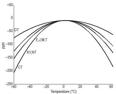 未補償AT切割晶體的公差可從-10°C至60°C降低至5PM,更寬的溫度范圍需要更大的公差,如圖3所示,顯示了一系列典型的AT切割頻率-溫度曲線.這些曲線可以用三次方程來表示,并且強烈依賴于石英貼片晶振坯料的切割角度.零溫度系數的點稱為上下轉折點.通過選擇切割角度,可以在需要的地方放置一個轉折點;另一個是固定的,因為兩者都關于20-30°C范圍內的一點對稱.轉折點之間的斜率隨著它們一起移動而變小.設計用于烤箱的晶體被切割,使得上轉折點與烤箱工作溫度一致.圖4顯示了幾次低頻切割的頻率溫度曲線.J形切口使用頻率低于10kHz,而XY形切口可以使用頻率在3kHz至85kHz之間.NT切割可以在10kHz范圍內使用.DT切割適用于100千赫至800千赫,CT切割適用于300千赫至900千赫. 負載電容
