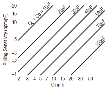 圖5顯示了頻率變化對負載電容變化的影響的典型曲線.或者,通常將晶體的可拉性表示為負載電容每pF變化的微調靈敏度,單位為ppm.這由以下單位以ppm/pF表示:
