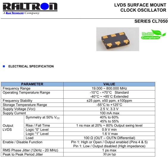 Raltron晶振,CL7050晶振,CL7050-155.520-2.5-25-X-T-TR晶振,小型SMD有源晶振,從最初超大體積到現在的7050mm,6035mm,5032mm,3225mm,2520mm體積,有著翻天覆地的改變,體積的變小也使產品帶來了更高的穩定性能,接縫密封石英晶體振蕩器,精度高,覆蓋頻率范圍寬的特點,SMD高速自動安裝和高溫回流焊設計,Optionable待機輸出三態輸出功能,電源電壓范圍:1.8V~5V,高穩定性,低抖動,低功耗,主要應用領域:無線通訊,高端智能手機,平板筆記本WLAN,藍牙,數碼相機,DSL和其他IT產品的晶振應用,三態功能,PC和LCDM等高端數碼領域,符合RoHS/無鉛.
