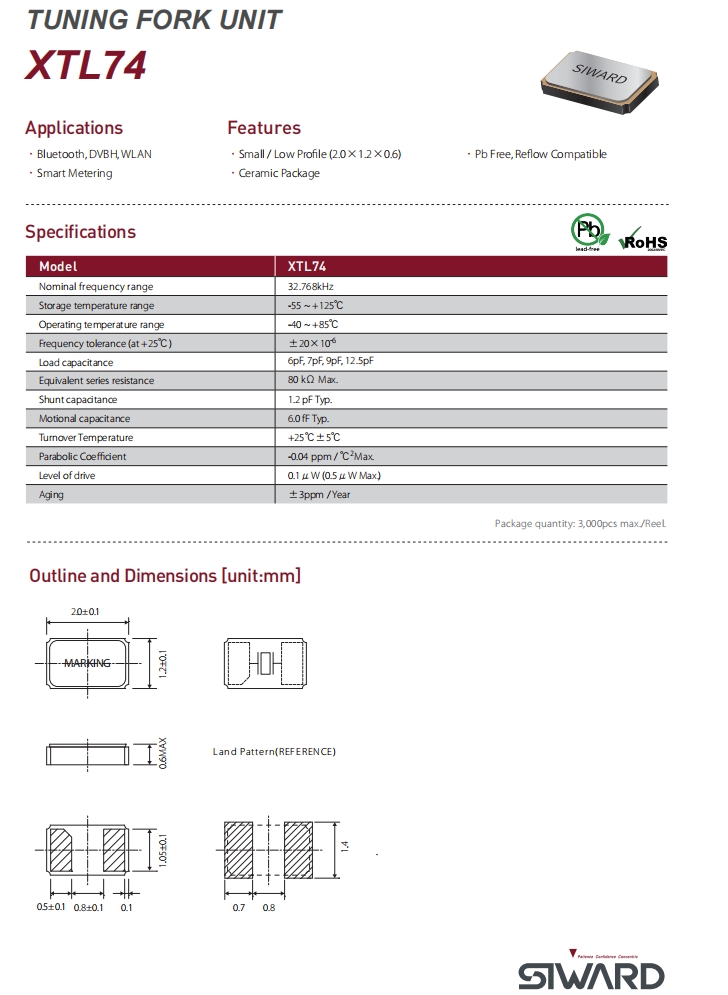 XTL741-S999-298 | Siward | Siward | CRYSTAL 32.768 KHZ 20PPM CRYSTAL | XTL74 | 32.768 kHz | ±20ppm | 12.5pF |