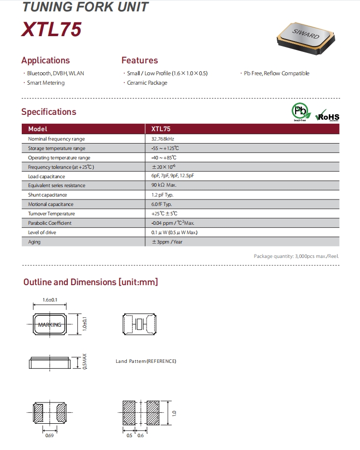 XTL751-S999-420 | Siward | Siward | CRYSTAL 32.768 KHZ 20PPM CRYSTAL | XTL75 | 32.768 kHz | ±20ppm | 7pF |