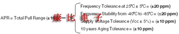 APR通過從VCXO的總穩定性中減去總牽引范圍來計算.總牽引范圍是恒定電源電壓和溫度下,壓控振蕩器頻率隨控制電壓變化的最大變化.總穩定性是指當控制電壓在制造公差,電源電壓,工作溫度和老化變化范圍內保持在標稱值時,VCXO頻率的變化.這種差異導致頻率變化,這是由于控制電壓獨立于所有其他條件和變化而得到保證的.
