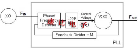 鎖相環通過將壓控振蕩器時鐘頻率和相位除以反饋分頻器(M)的值,并將其與相位/頻率檢測器中輸入時鐘頻率和相位(FIN)的相位和頻率進行比較,從而產生誤差信號.相位/頻率檢測器的輸出由環路濾波器進行低通濾波,以產生FOUT的控制電壓調整,從而閉合環路.鎖定時,鎖相環的輸出頻率(FOUT)正好是輸入頻率的M時代,并與輸入參考時鐘相位對齊.如果Fout必須等于Fin,則添加值為M的后分頻器或將M設置為1.