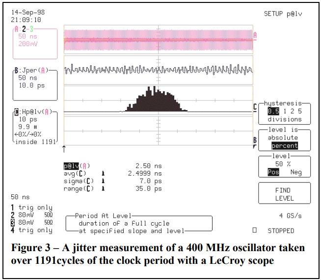 Short term stability is a function of noise signals within the oscillator and represents a phase modulation of the oscillator output. Short term stability can be specified in the time domain as jitter. The greatest drawback to this method of specifying short term stability is that it is dependent of the measurement interval. The longer the measurement observation time the greater the peak to peak jitter magnitude. Figure 3 shows a typical jitter measurement of a 400 MHz Surface Acoustic Wave (SAW) oscillator. The mean or average period is 2.4999 ns with an rms jitter (sigma) of 7 ps and a peak to peak jitter (range) of 35 ps. Note that the manufacturer of this oscillator specifies that peak to peak jitter for a measurement duration of 1000 cycles.